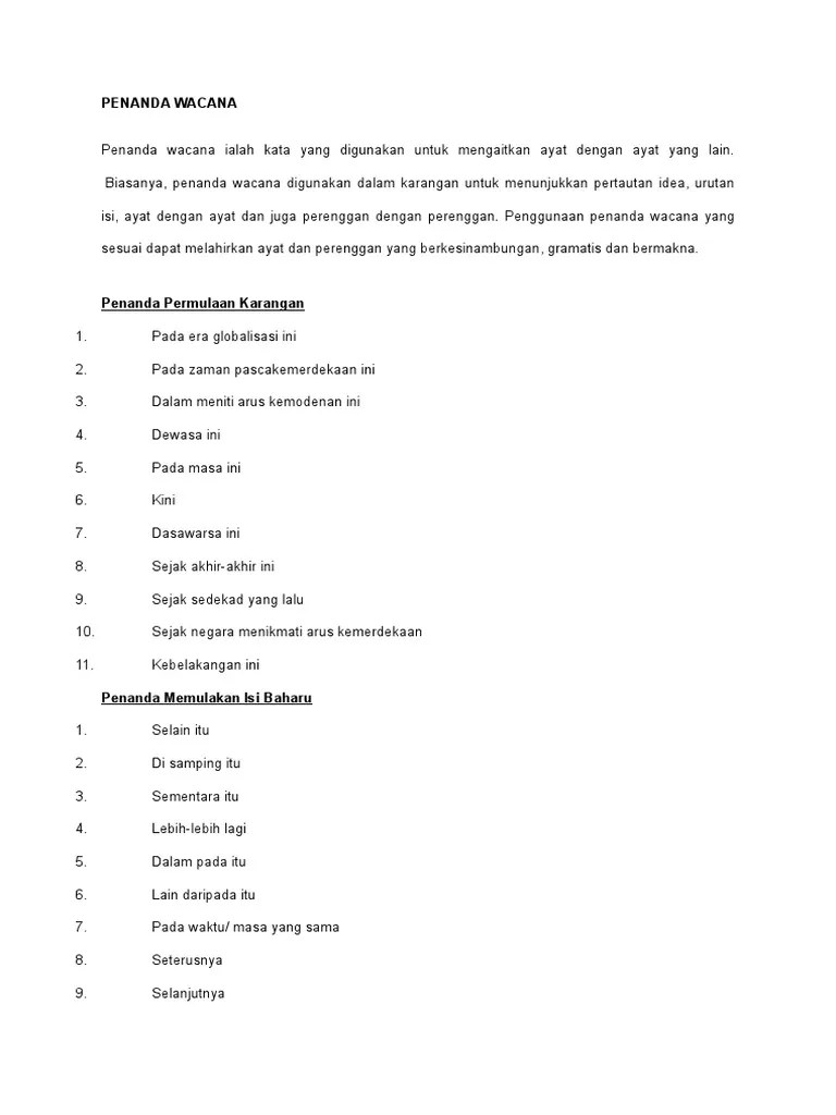 But he is talking about native english speakers who are able to stay in foreign countries for a long time and still don't learn the language . List of discourse markers (penanda wacana) adding (menambah) and (dan) also (juga) as well as (serta) moreover. Okay, many people who learn english as their secondary language struggle to use penanda wacana (or discourse · cause and effect: Penanda wacana digunakan untuk menulis ringkasan dan pemahaman, karangan. @____hidayah our group knee buat bahagian eng & bm. English teacher at smk batu lapan sik. · because, so, therefore, thus, . 0:00 / 4:49•watch full video. Contoh karangan/ essays/ writing bahasa inggeris (english) spm / muet. Discourse markers or in malay 'penanda wacana' references for dummies. Furthermore, in addition, not only this, apart from that, besides,. 4 hours ago — wacana penanda contoh essay sosial bahasa untuk. I) penanda wacana untuk memulakan karangan.